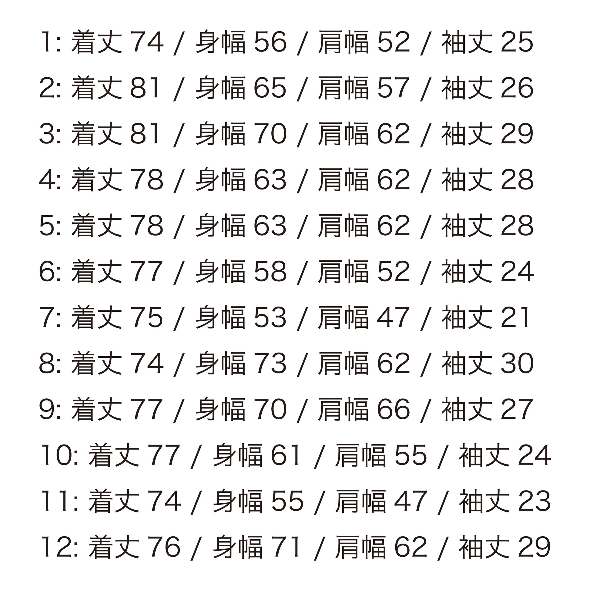 画像順に番号のサイズ表を参照してください。